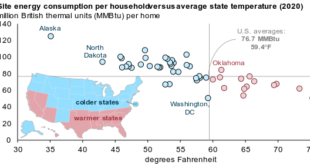 The eia article U.S. households in warmer states consumer less site energy than household in colder states by Greg Lawson and Mickey Francis (5/4/2023) provides this great graph. Site energy refers to the amount of energy that enters a home, including electricity from the grid, electricity from onsite solar panels, natural …