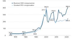 The Economic Policy Institute article CEO pay has skyrocketed 1,460% since 1978 by Josh Bivens and Jori Kandra (10/2/2022) include the chart here. Definitions first: The realized measure of compensation includes the value of stock options as realized (i.e., exercised), capturing the change from when the options were granted to …
